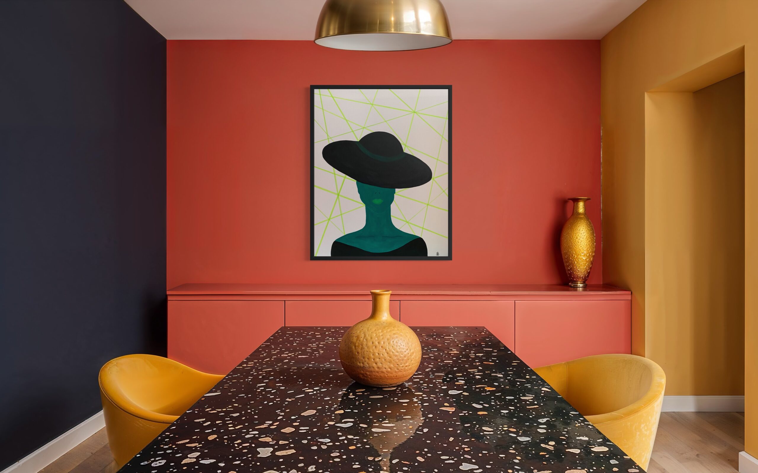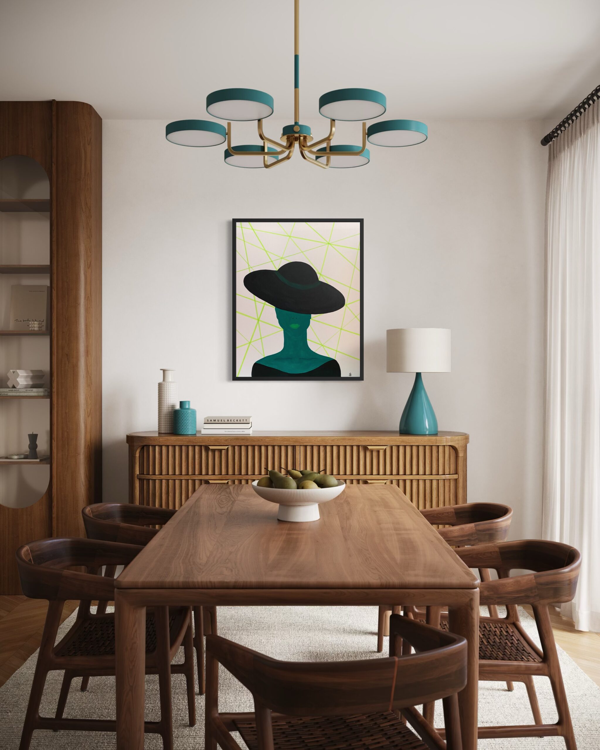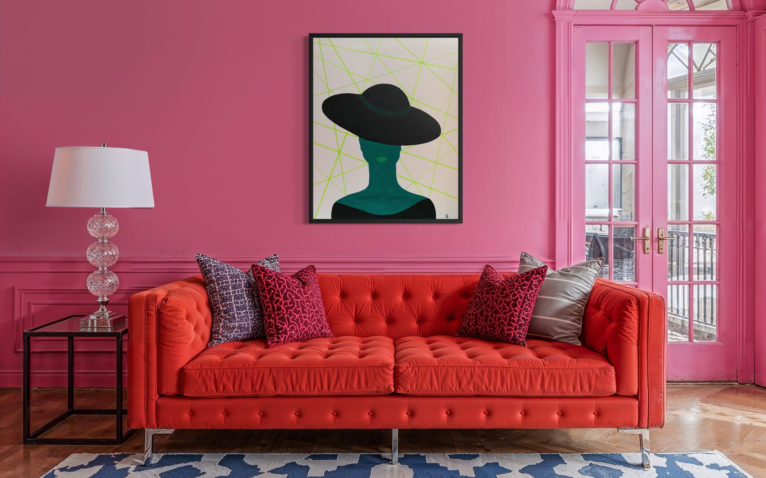 Die Grüne Dame mit Hut zeigt sich in der Frontalansicht vor neongrünem Raster auf weißem Hintergrund