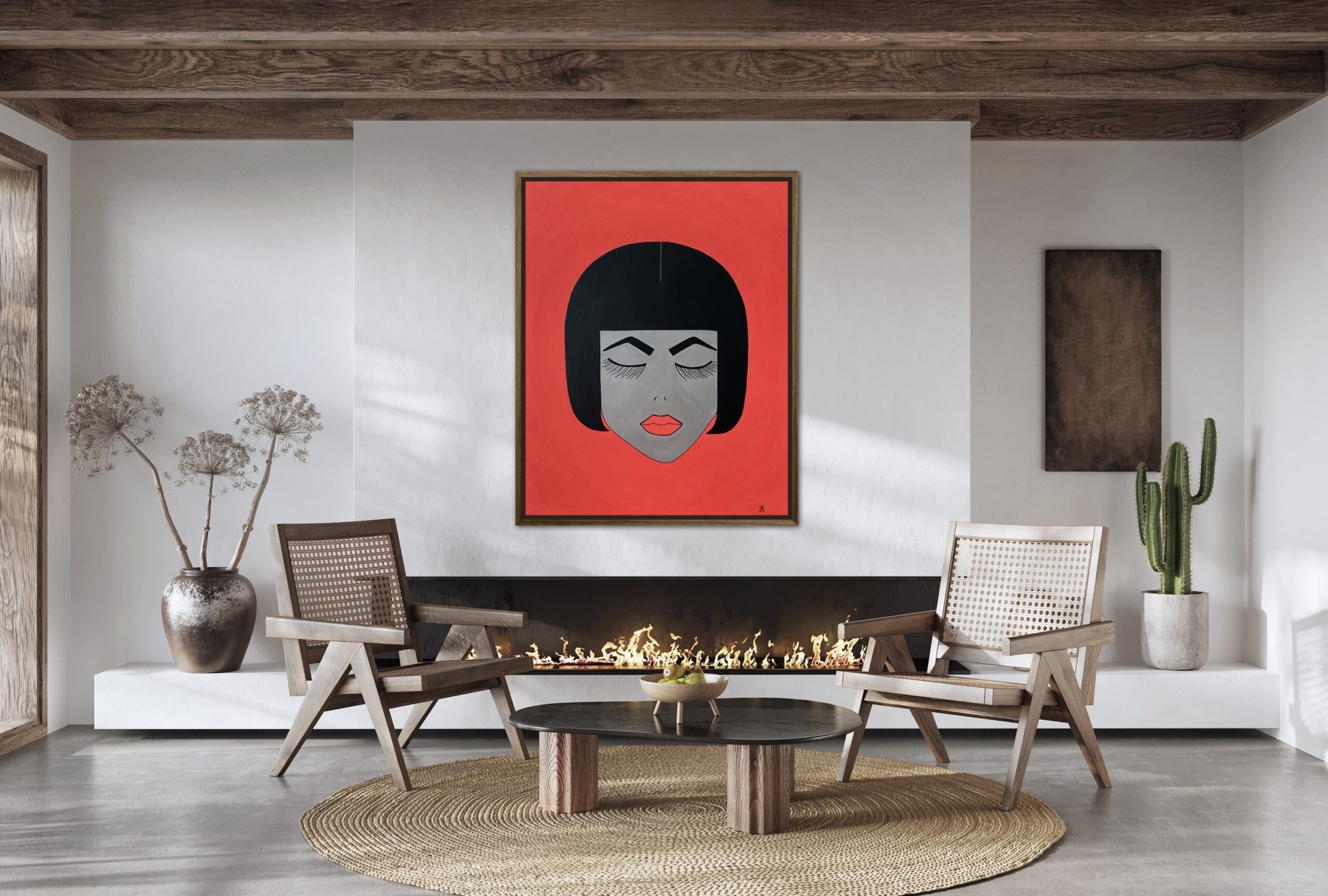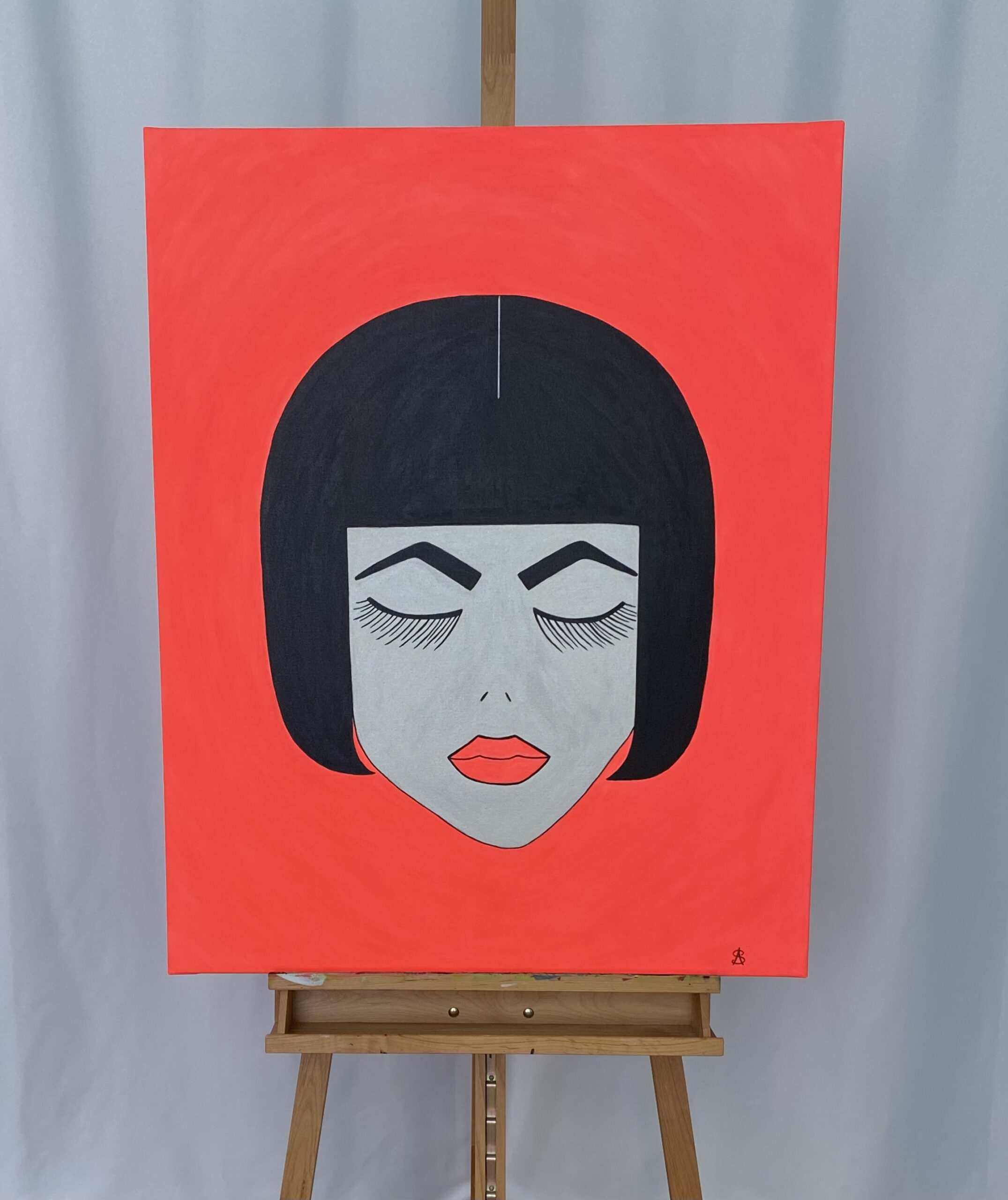 Kontrastreich steht zum Porträt der leuchtend orange-rote Hintergrund.